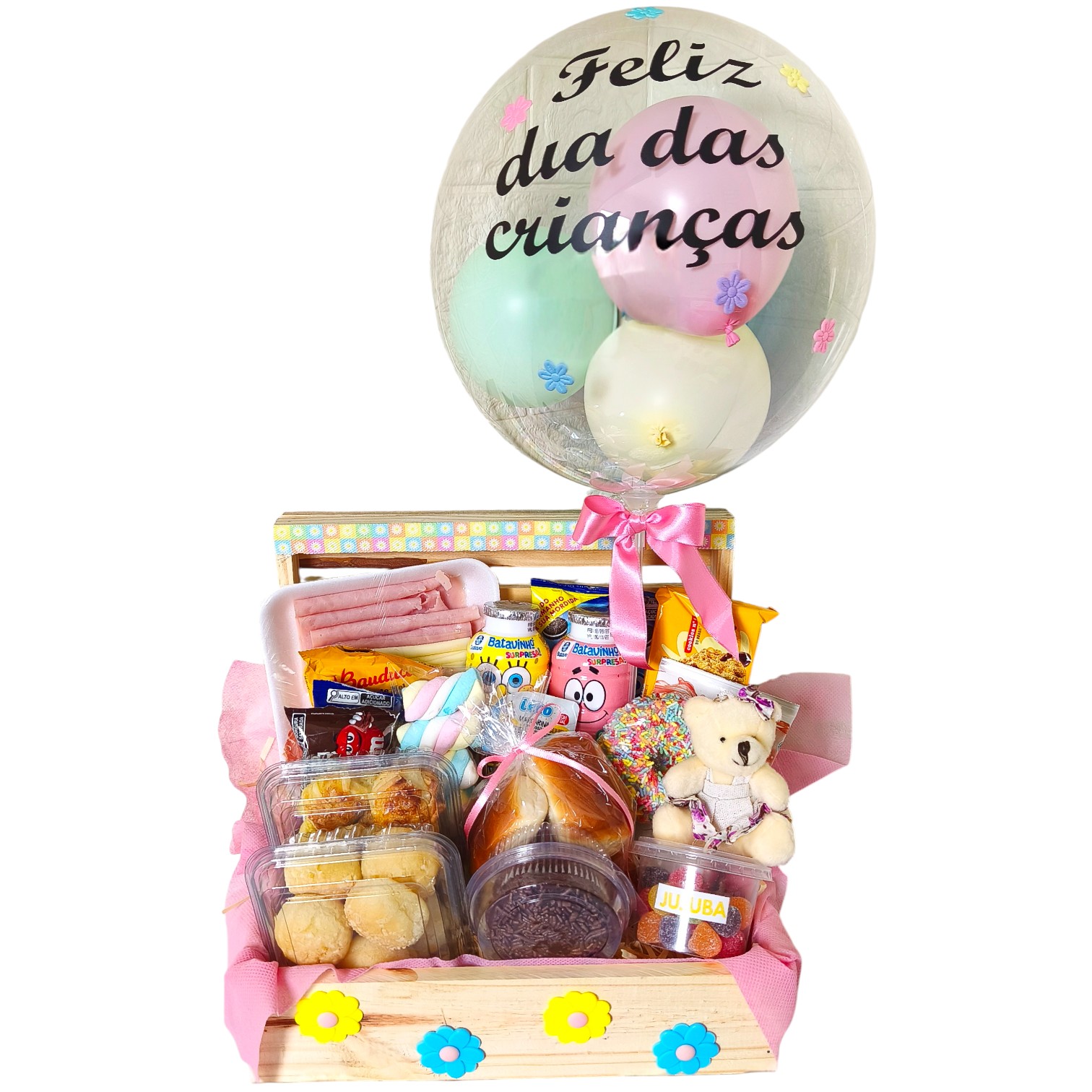 Cesta infantil, montada com muito cuidado, ela contém uma seleção deliciosa de itens frescos e de qualidade: